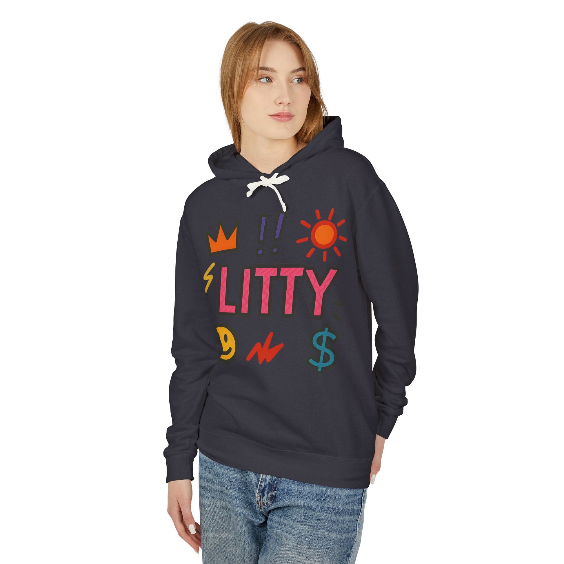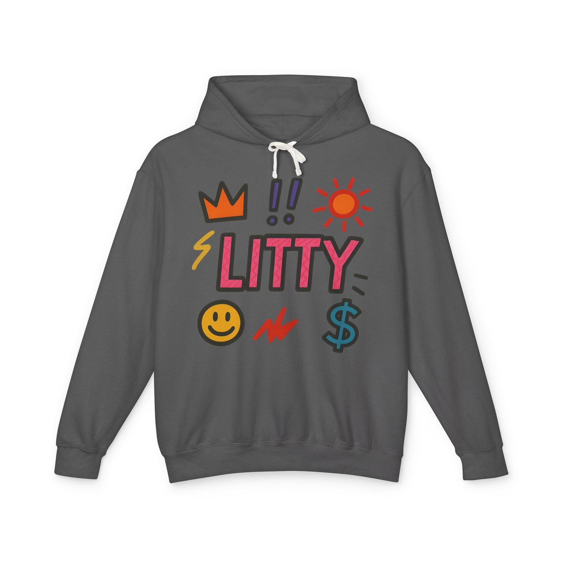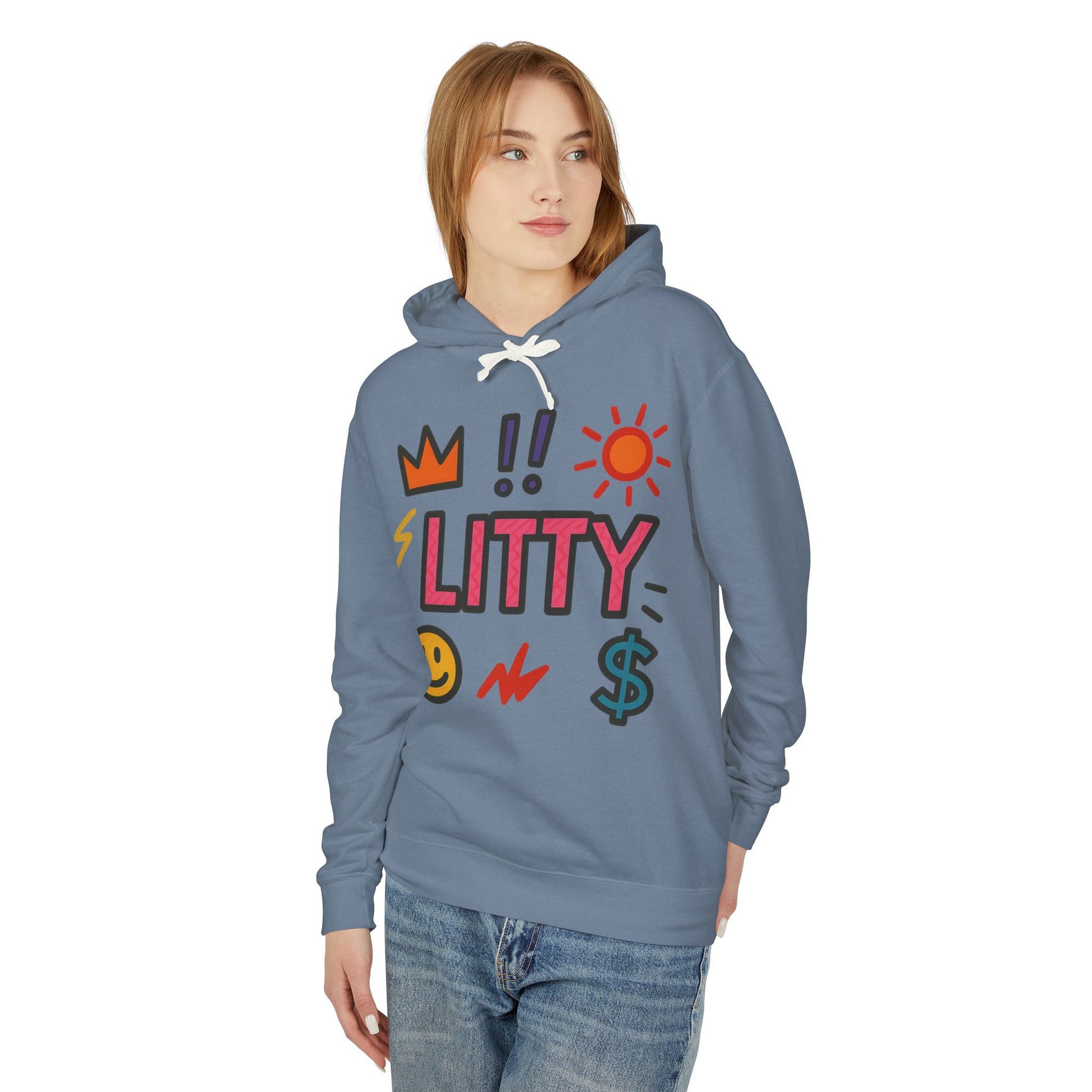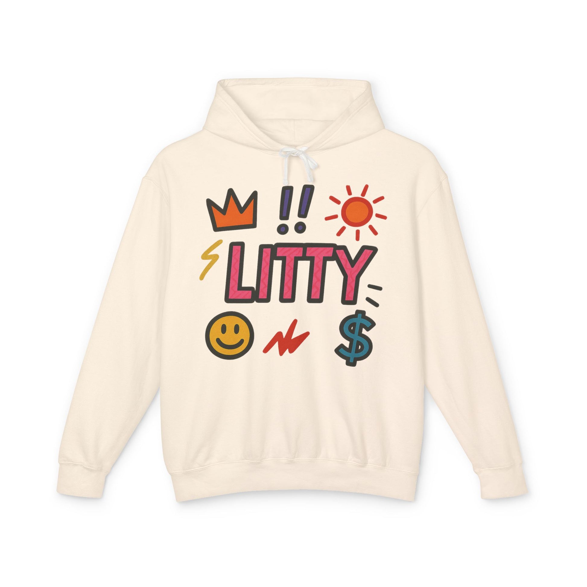 This lightweight hooded sweatshirt brings playful, upbeat energy to everyday wear. The front features bold, hand-drawn icons — crown, sun, lightning, smiley face and dollar sign — surrounding a bright, blocky "LITTY" wordmark that reads like a shout of confidence. The soft, natural-toned fabric and relaxed cut make it feel like a lived-in favorite from the first wear. Wear it on crisp mornings walking the city, to low-key hangouts, or layered under a jacket for shows and late-night runs. The subtle logo at the upper back keeps the vibe cohesive without shouting, so the hoodie reads as both fun and intentionally styled.
